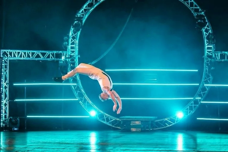 | Am 9. November waren wir dann sage und schreibe mit 16 Personen beim inklusiven Aktionstag des GOP-Varieté-Theaters in der Show „YOUniverse“. Alle 16 - davon 6 Gehörlose und 10 Schwerhörige - waren von dem Programm total begeistert. Die Idee, Artistik mit Elementen der digitalen globalisierten Welt zu mischen, kam ausgesprochen gut an. Das Geschehen auf der Bühne wurde dabei zeitgleich oder zeitversetzt in Gestalt typischer Chat- oder Blog-Apps neben der Live-Performance auf drei smartphone-artigen großen Bildschirmen an der Rückwand der Bühne projiziert. Dadurch entstanden ganz neue, ungewöhnliche Perspektiven auf die Artisten und ihre Darbietung. |